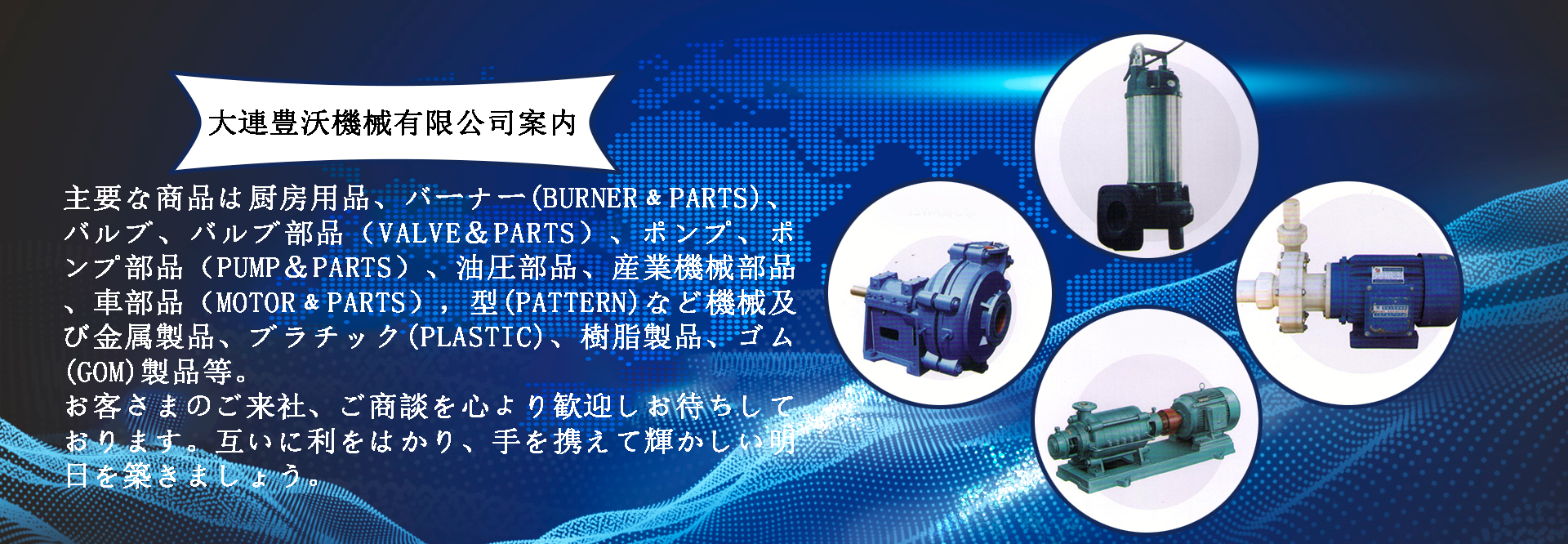 大連豊沃機(jī)械有限公司は國際貿(mào)易を主にして 専門商社でおり、子會(huì)社の機(jī)械加工工場を1社持ち、業(yè)務(wù)提攜パトーナが數(shù)社あります。國際貿(mào)易を従事して十年以上、メインは日本向けですが、アメリカ、ューロパ市場向けも少しあります。砂鋳造(CASTING)(FC,FCD,FACD,ADI)、ロストワックス(LOST-WAX)、鋳鋼(SC,SCS)、ステンレス(SUS)、ダイカスト(DIE-CASTING)(アルミ、真鍮)、鍛造(FORGING)、プレス(PRESS)、製缶(WELDING)など幅多く分野ております。主要な商品は廚房用品、バーナー(BURNER﹠PARTS)、バルブ、バルブ部品(VALVE&PARTS)、ポンプ、ポンプ部品(PUMP&PARTS)、油圧部品、産業(yè)機(jī)械部品、車部品(MOTOR﹠PARTS),型(PATTERN)など機(jī)械及び金屬製品、ブラチック(PLASTIC)、樹脂製品、ゴム(GOM)製品等。